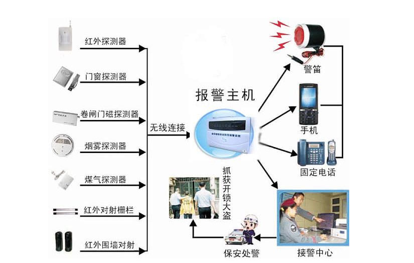 防盗报警系统与出入口控制系统、闭路电视监控系统、访客对讲系统和电子巡更系统等一起构成了安全防范系统。 防盗报警系统通常由前端、传输、控制三部分组成。前端包含各类探测器,(又称防盗报警探头)分为有线和无线两大类;传输分为有线传输和无线传输(无线传输又分为网络传输和CID协议传输);控制部分一般是报警主机,分为无线报警主机、有线报警报警主机(有线报警主机又分为分线制报警主机和总线制报警主机),控制部分还可以扩展到接警中.心主机。